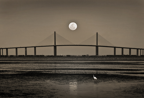 I think my conversion to of this image to black and white helps emphasize the beautiful design of Tampa Bay's Skway Bridge. Of course I got lucky with the moon and the egret for pretty cool secondary interests. It is hard to see but the egret is looking right at the camera, and smiling, I think.